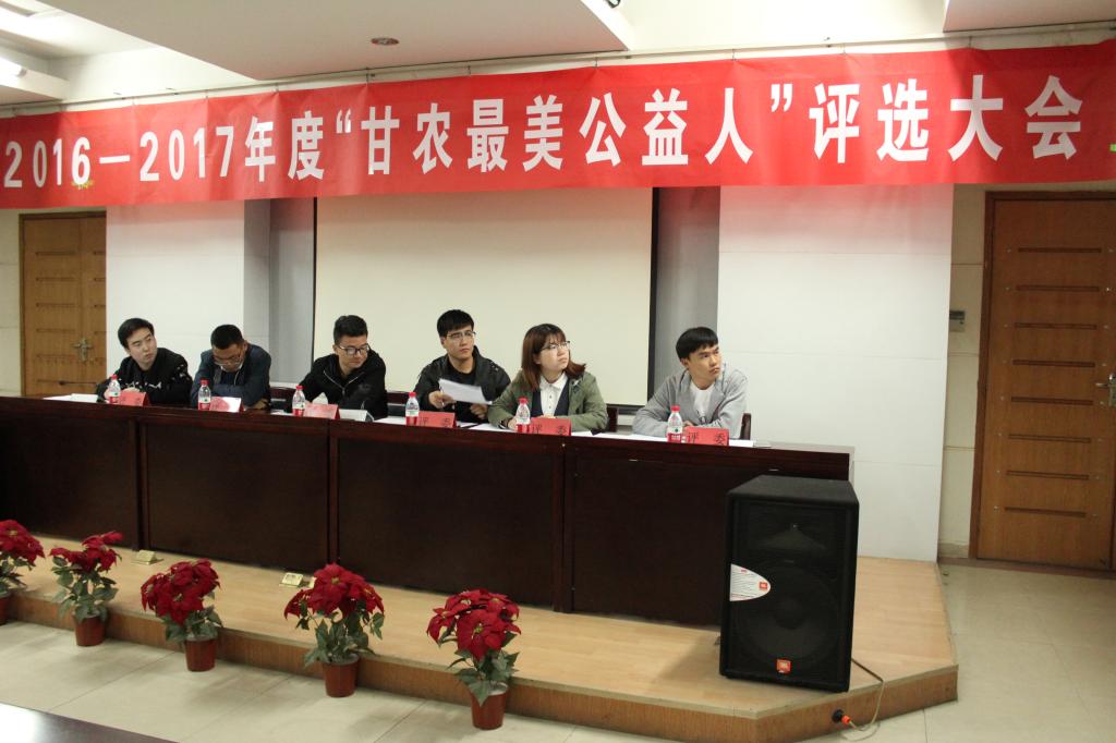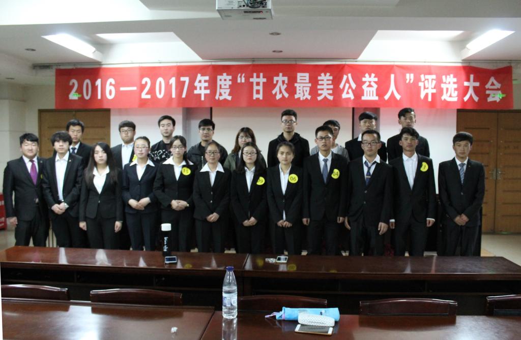 第五项,由校团委办公室主任雷佩彪同学公布此次评选结果,第一名,来自生命科学技术学院14生物技术植物方向的金祥栋同学,第二名,来自人文学院14级翻译专业的李廷祥同学,第三名,机电工程学院15电气工程及其自动化2班王海旭同学;第四名,财经学院16农林经济管理基地班的王维同学;第五名,财经学院16金融1班的祁秀国同学;第六名,动物科学技术学院16动科二班的马龙刚同学;第七名,人文学院翻译专业的王旭萍同学;第八名,动物科学技术学院16动科二班的张晓同学;第九名,财经学院市场营销专业的王永花同学;第十名,植物保护学院15级植物保护1班的马宏萍同学。第六项,评委与公益人合影留念,2016——2017年度“甘农最美公益人”评选大会完美落幕。